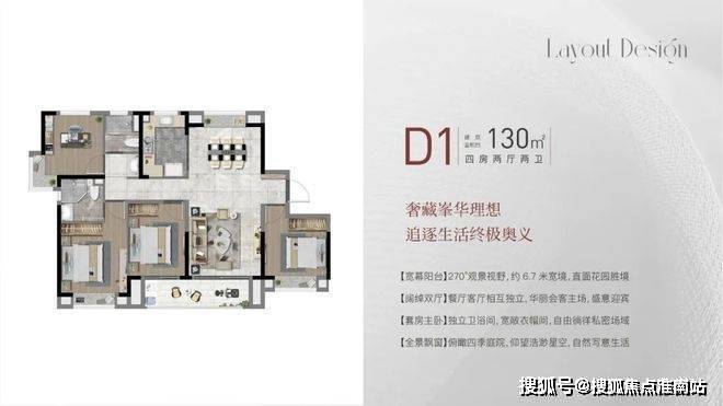 建面约130㎡4房2厅2卫, 大名城映雨江南售楼处电话:400-9659-259做到了 四开间朝南+南北通透+主卧套房设计+双阳台设计+卫生间干湿分离,“一步到位”大4房,空间尺度非凡。 大名城映雨江南售楼处电话:400-9659-259