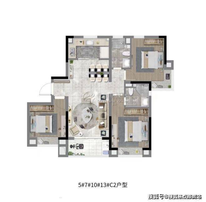 双阳台设计,大名城映雨江南售楼处电话:400-9659-259客厅+次卧南连宽景阳台,室内的采光度非常优秀;