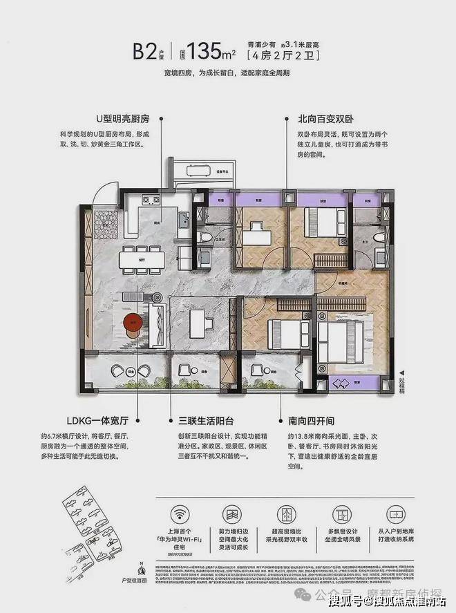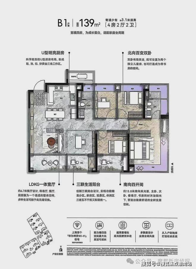建面约139㎡4+1房户型,四开间朝南+4飘窗+2个约270°转角飘窗,不管是从什么层面来看这个户型,在市面上都几乎是没有对手的。