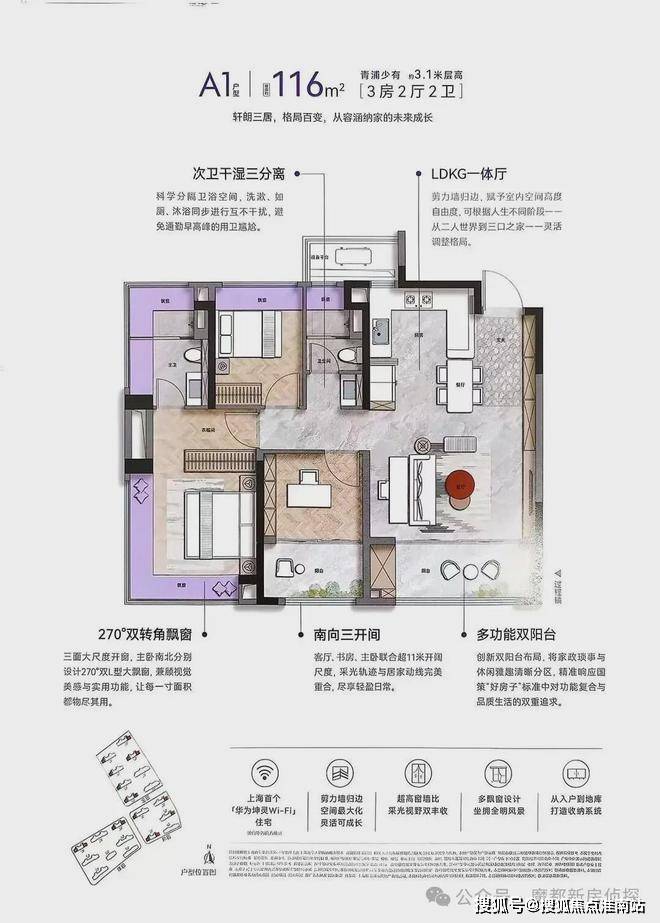 建面约116㎡3房2卫动静分离的户型,几乎是这个市场上最好的户型。