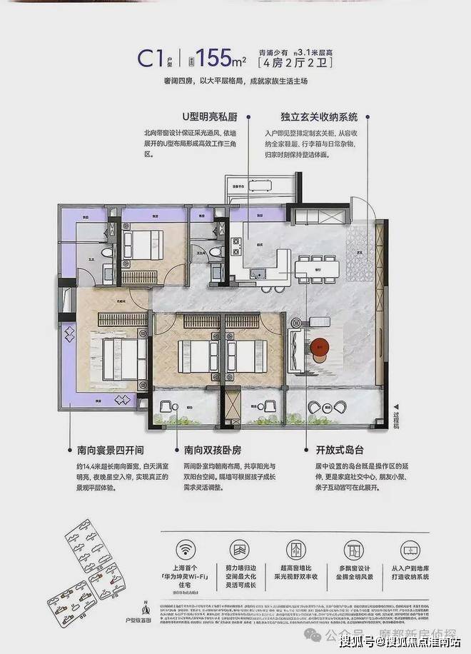 建面约155㎡的顶奢4房产品,四开间朝南,三间卧室全朝南。并且两间南次卧的尺度感可都是主卧级的。加上宽奢的客餐厅+阳台空间,这是真正一步到位的终极改善产品。