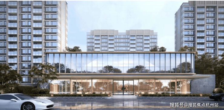 项目建筑为现代极简风格,外立面采用多彩真石漆+香槟金色铝合金线条,顶部的塔冠设计是标志性特点。