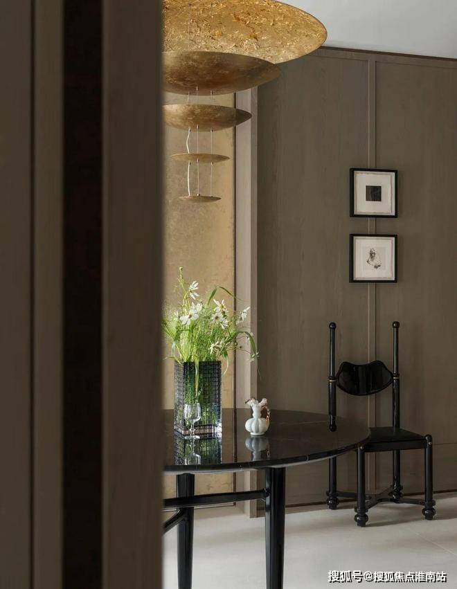主卧前厅的金箔饰顶灯投射出闪烁的光芒,恰好映照在大理石桌面和精致的瓷制品上,散发出淡淡的芬芳。
