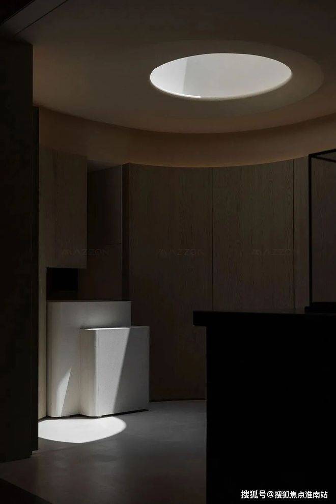 沿着私人藏品区向右走,便是一座展示品味与文化修养的小型画廊。右侧的洞口让光线透入,与室内浅色装饰相得益彰,充满神秘感。