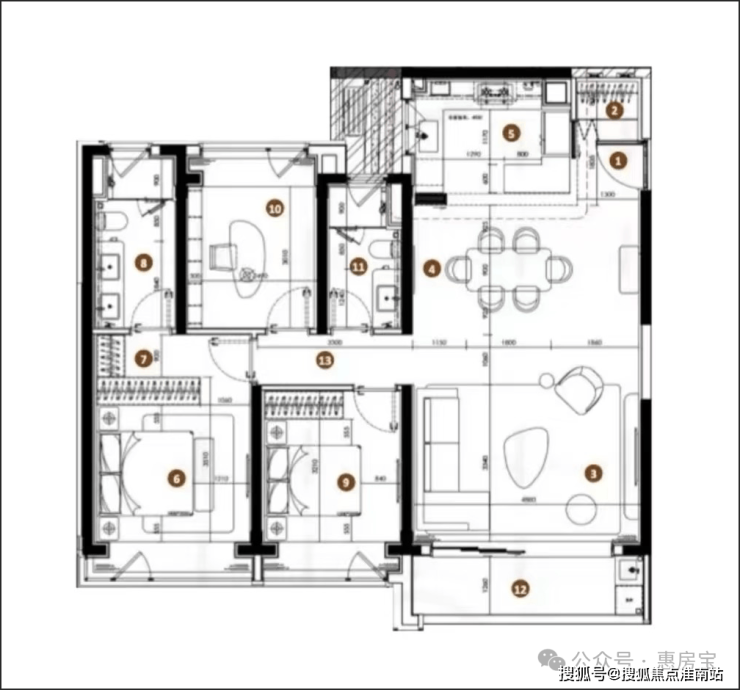 建面约132m3房2厅2卫共计112套,两梯四户边套无连廊影响,132平只做了三房布局,各空间尺度足够开阔,同样是经典的动静分离户型!
