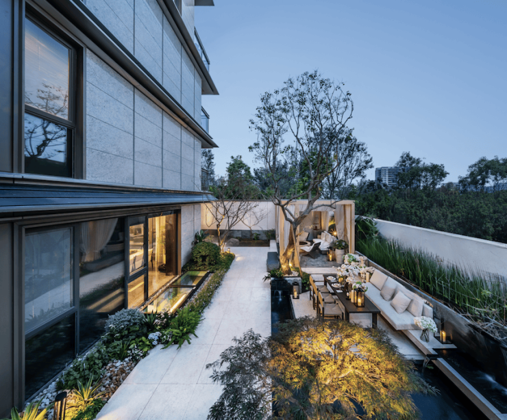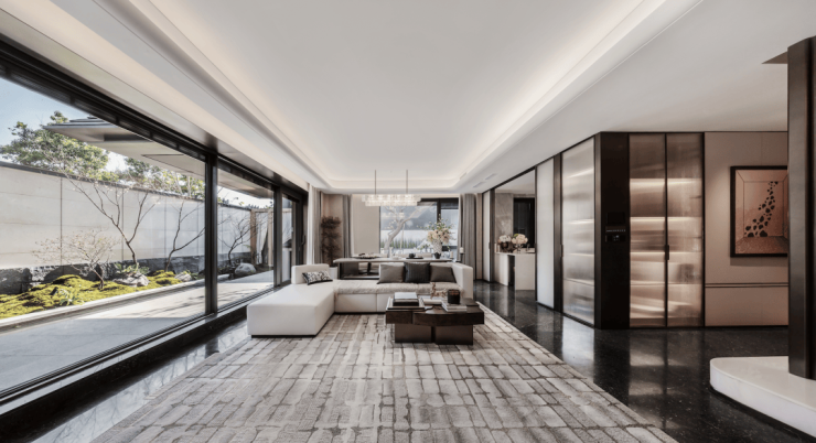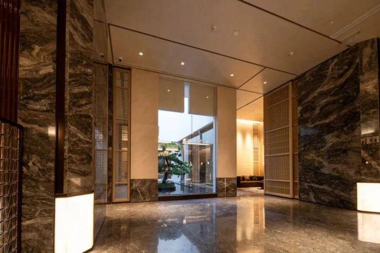 外立面同样使用到石材,大面玻璃及落地窗,搭配铝板和中空LOW-E三玻两腔,既美观,又和东方美学园林相得益彰。