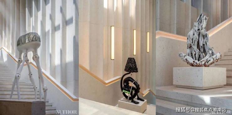 沿着台阶拾级而上,两侧是通体象牙质地色泽的 贝金米黄石材铺面,沿路是精心配置的艺术品陈列,给国际化审美的客户强烈视觉冲击。