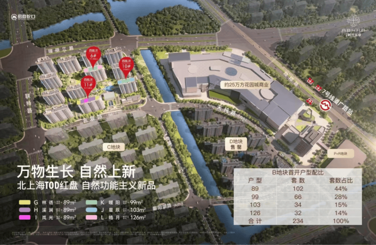 项目整体由三幅地块组成:2幅普通商品房+1幅商业用地。整个地块中商业占比53%,约17.48万㎡,住宅占比47%,约15.49万㎡,本次全新升级花园城商业,为招商蛇口在上海打造的第四座花园城,将延续商业X+的模式。