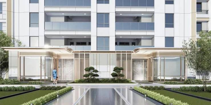 社区入口对标慢奢酒店风格打造,融入高定细节,诸如酒店感仪式门头+环岛式尊崇落客+迎宾式花园设计+精装地库等。