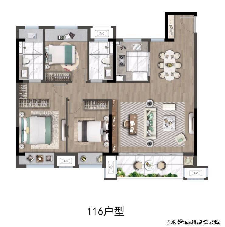 主力户型:建面约70-136㎡,包括101㎡、116㎡的三室两厅两卫等