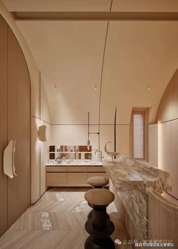 整体以米白色调为主,加入了少许鲜亮橘色,烘托休憩情绪。主卫浴采用双台盆设计,方便双人同时使用,由天然洞石打造的卫浴空间更具有一种低奢隐逸的度假气息。