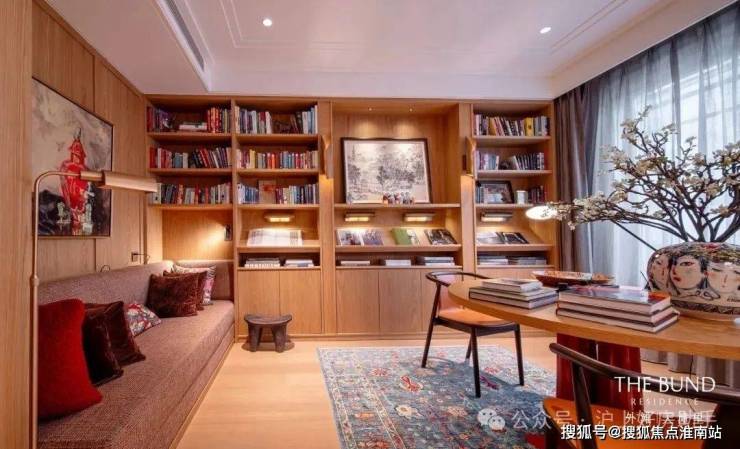 多功能书架彰显着设计的巧思,形成有如博物馆般的展示方式,即可放置日常读物,亦可展示珍本藏书。同时,利用屏风做隔断,与圆桌结合形成私密空间。