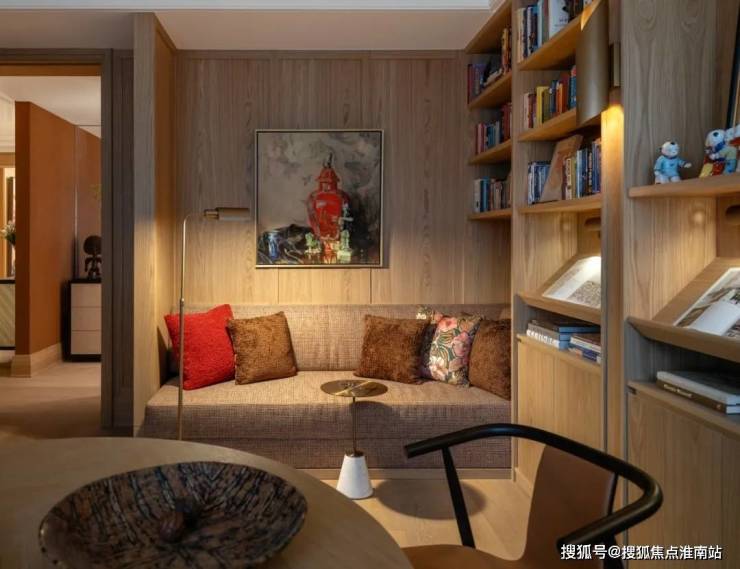 可坐可卧的软塌,让书房升级为舒适安逸的精神领地。一杯咖啡,一本好书,一张黑胶,消磨一段悠闲的午后时光。