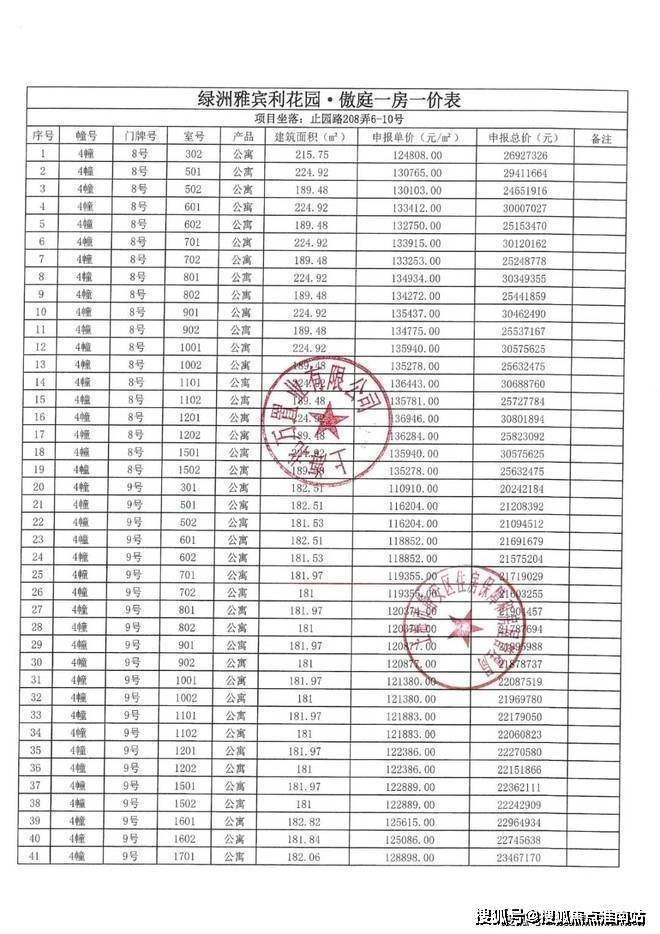 上期一房一价表如下: