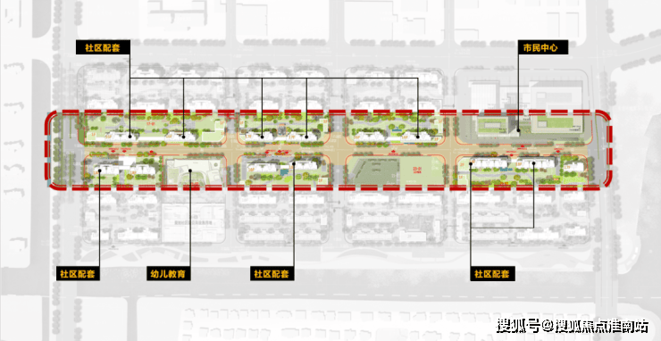 其中,一轴为生活街区轴,其聚合了文化活动室、生活服务中心、市民中心等丰富的公共空间,下楼可轻松享受到多元且丰富的邻里社交生活。