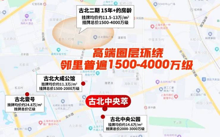时至今日,古北依旧是企业主、高管与精英聚集地,古北中央萃周边邻里多为1500-4000万级高端住区,圈层高度始终在线。