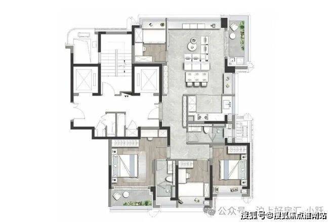 客餐厅一体化,面宽约4.9米,整体空间近40㎡,如果包进阳台尺度接近45㎡,给一家人提供了阔绰的交流空间,与市面上160㎡的四房拉平。