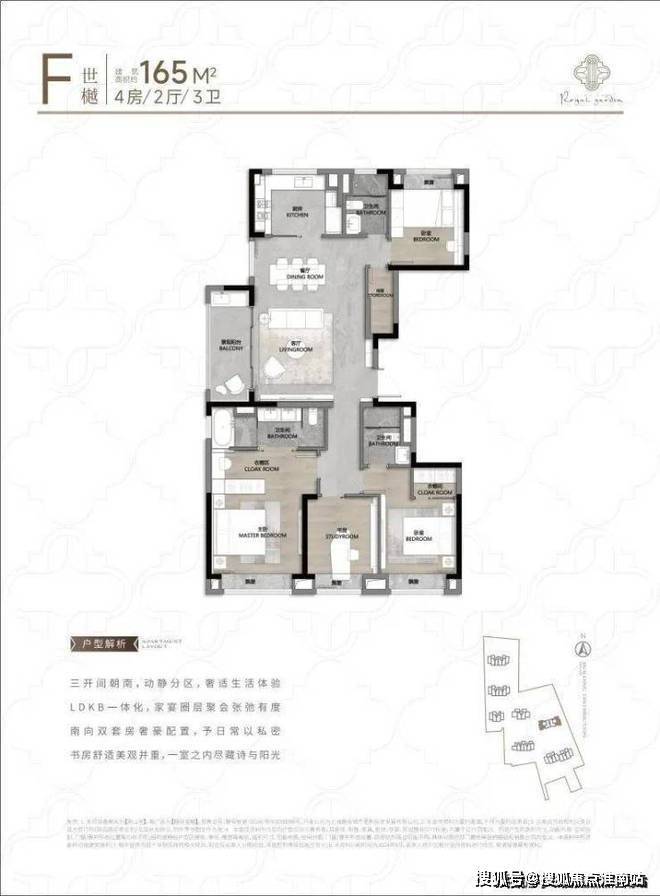 104㎡3户型特点:该户型多为楼栋的东边套,是一个观景户型。客厅连接270°阳台,视野出众。双卧朝南,阳光满溢。从次卫布局看,如果家庭人口较少,该户型还能做成双套卧。