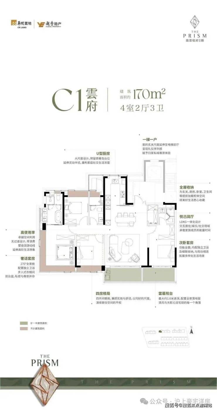 170㎡四房两厅三卫聚焦品质改善巅峰需求,堪称"终极改善首选"。户型采用横厅设计,客厅面宽达8.5米,连接全景阳台,采光与视野极佳;四开间朝南,南向总面宽超16米,餐客厅一体化面积达65㎡,举办家庭聚会毫无压力。双主卧套房设计分别配备独立卫浴,兼顾主人与长辈的居住私密性;专属家政间与储物间设计,提升生活便捷性的同时,满足家庭海量收纳需求。