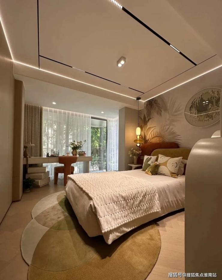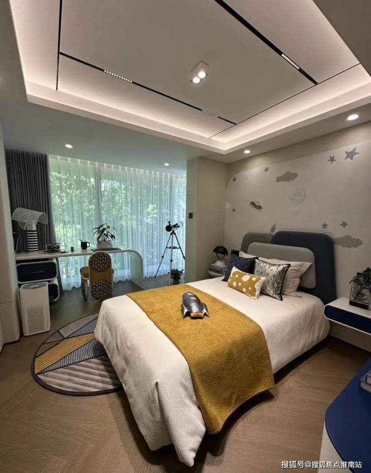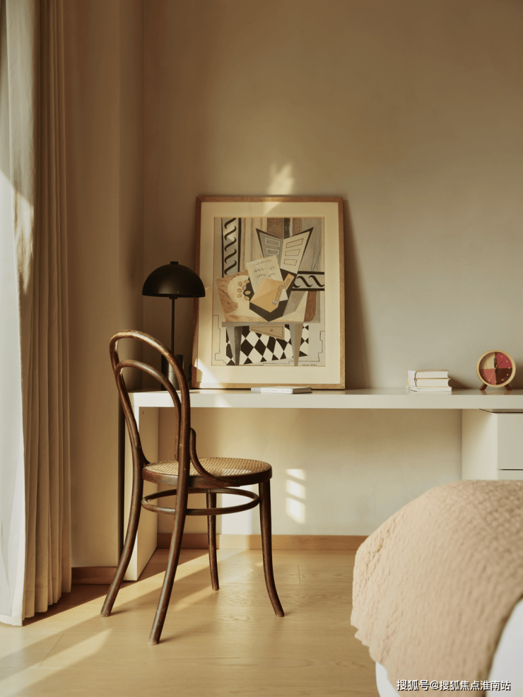 女儿房也是采用了饱和度较低的杏色和木色为主,这种简单的而不那么复杂的元素叠加,通过光作为空间的主角,让这种大自然的色彩更能突出一种宁静、温暖。