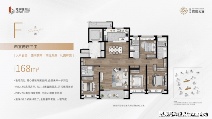 168㎡四房两厅三卫:总价约 1100 万元起,楼王户型,南北通透,6.8 米横厅 + 双阳台,可俯瞰 1.5 万方中央景观轴。