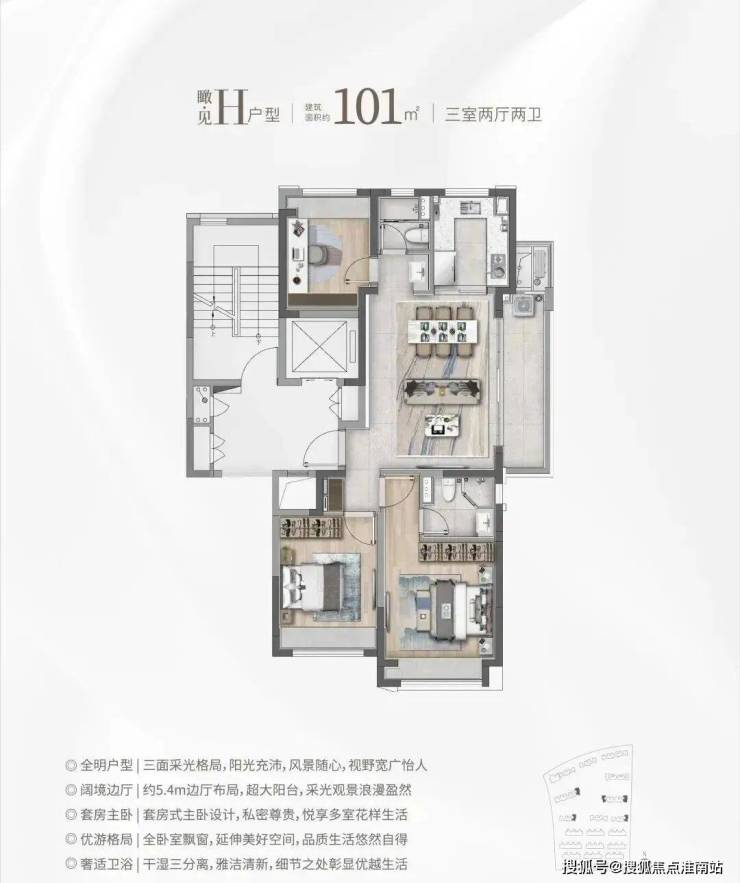 三面采光,全能景观王炸边厅户型!同样是3房2卫的配置,功能性与舒适度兼具。