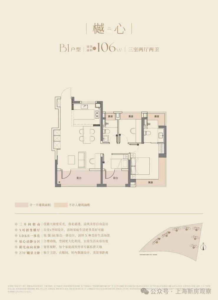 建筑面积约106㎡户型,更是以宽尺大横厅和270°的转角飘窗赚足了眼球,阳光与清风自由流淌,居住舒适度全面提升。LDKB一体化设计,在餐厨区布局万能中岛台,打破了厨房与餐厅的界限,延伸烹饪空间,增加收纳空间,更将社交功能融入其中,重塑中国人的情感场域。