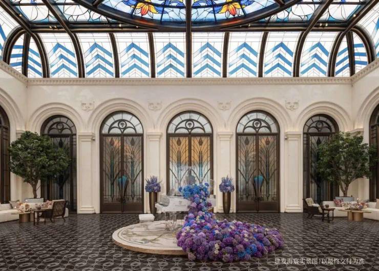 「华亭烟雨」造设波光喷泉与孔雀雕塑,八株紫玉兰盛绽其间,将自然之力凝聚为艺术语言;「千步廊」汲取和平饭店的设计灵感,地面通铺同款“金珠算盘”,并融入绒绣、顾绣、海派玉雕等“上海非遗十绝”,将海派东方的摩登风韵尽致演绎;「孔雀厅」同源上海华尔道夫酒店精髓,约14米挑高宏阔大堂,开阔奢华,穹顶巨幕彩绘玻璃,历经团队三轮打样,终成绮丽之景。