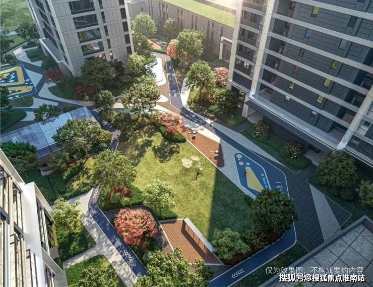 与常见的一字排列方式不同,项目3幢楼栋呈“品字形”的围合式布局,内部空间更是打造了层次丰富的“一心一环三节点”的园区景观,儿童乐园、环形跑道等场地,能满足多龄段业主对休闲空间的需要。