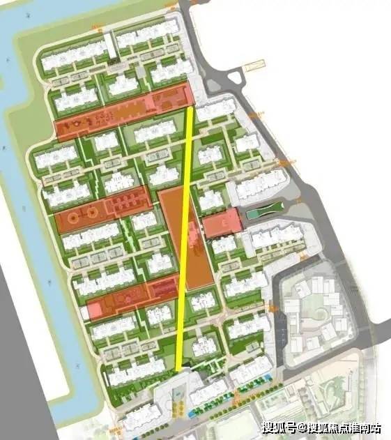 红色:景观组团 黄色:绿化轴
