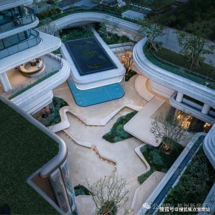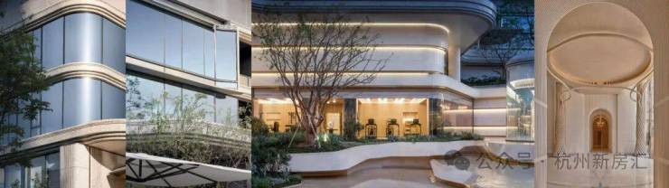 因项目整体抬高,从下沉庭院到架空层“空中花园”的落差极大,形成独特的峡谷地貌,杭序府的设计团队汲取九溪烟树为造园灵感,打造一个立体多维的城市溪谷交互园林;因项目毗邻江岸,杭序府的外立面以“站立的江潮”为灵感,