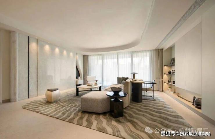 12栋13-16F建筑交错排布,楼体的高差延伸为波涛起伏的天际线,璀璨壮阔如不息的江潮。摒弃当下的流行,杭序府在建筑立面上采用非对称设计,并精心打造形如疾风卷浪的横向线条,配合标志性建筑中部折线“凌云翱翔”以及折角飞檐“桂冠江河”,再次刷新作品的艺术张力。