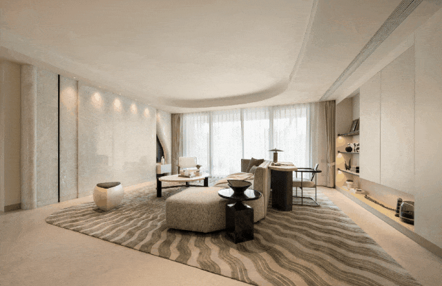 漆砚260㎡户型:户型参考漆砚制作方式,以“玉德”显质地,以“金声”隐赞誉,主卧吊顶还原砚台之形,以漆砚般闪耀琢序空间。
