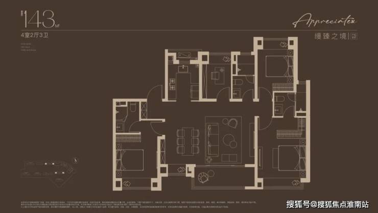 建面约143㎡四房设计,不论是三代同堂还是二娃家庭,都舒居无忧!2梯2户的设计, 极具私密性的入户门厅,彰显大宅归家礼序 。独立玄关,既是归家仪式感,更添收纳空间;约14米朝南面宽,搭配约7米尺度横厅,尽显大宅风范; 东西双套房设计,奢享全龄世家的静谧时光。