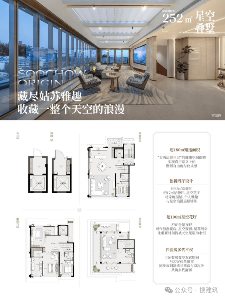 星空花厅创新:超100㎡顶层空间,搭配270°全景视野,突破传统屋顶局限,创造星空下的浪漫生活场景。