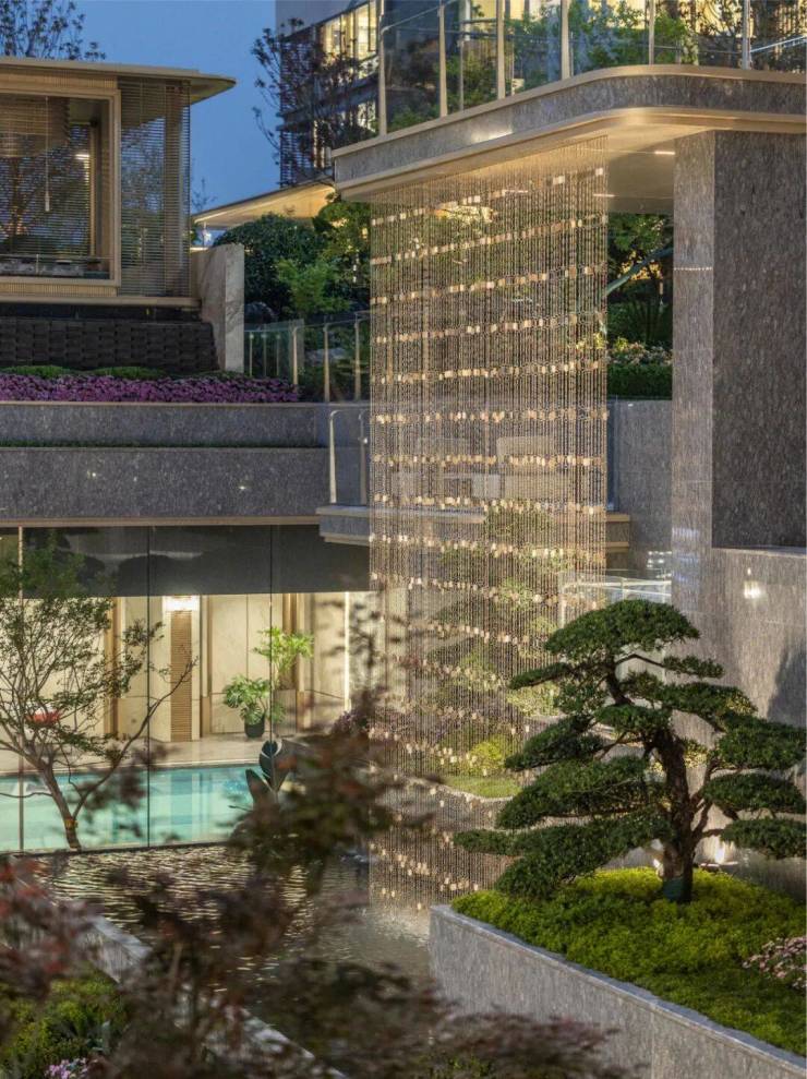 其中下沉水院作为关键归家场景之一,以水为引,叠瀑飞流,对景廊架,还有风景连廊,搭配波光粼粼的镜面水景和绿植点缀。