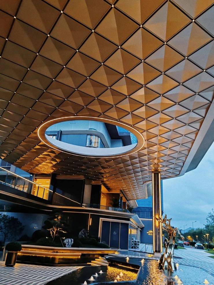 示范区入口处的雨棚吊顶是该项目的一大亮点。铝板们经过固定角度的弯折设计变得凹凸有致,依次铺排之后呈现波光灵动,削弱几何图形“一板一眼”的刻板影响,折射“艺术”所承载的美轮美奂。