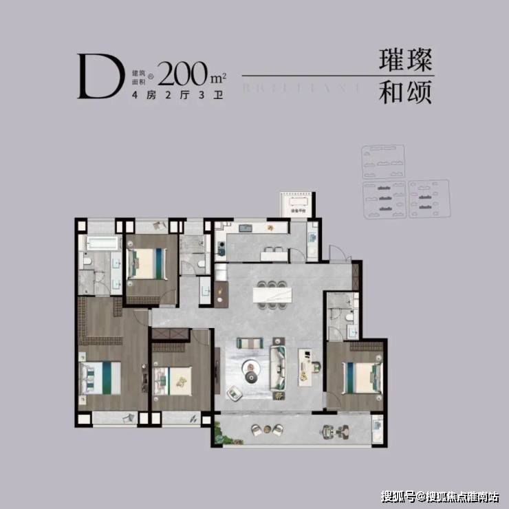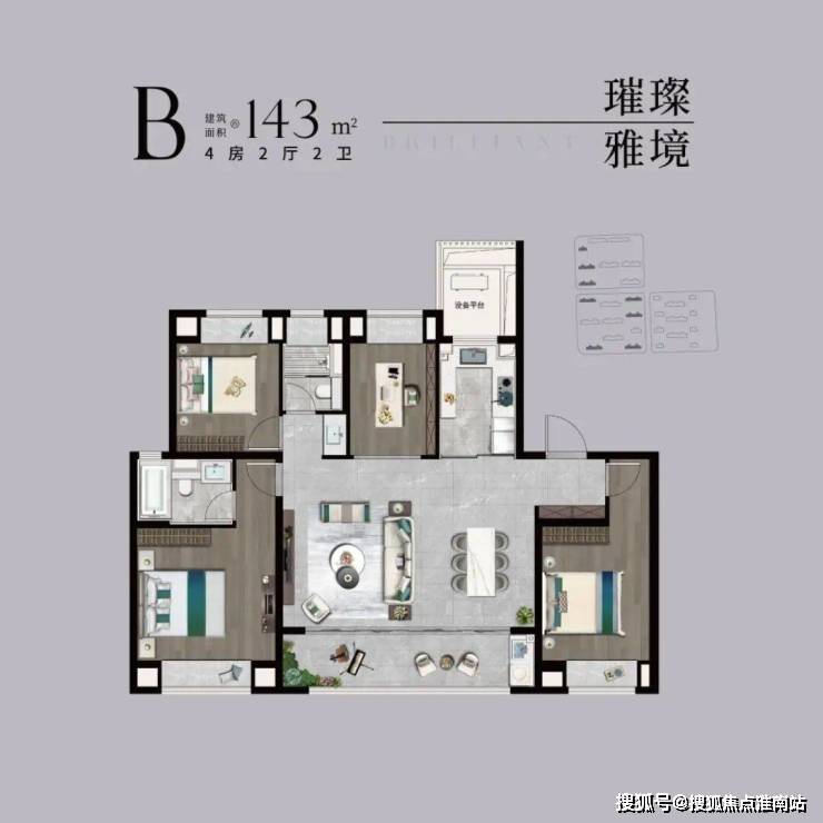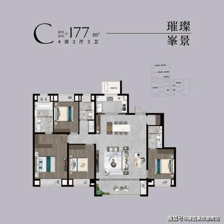 项目主力为四居室改善户型,得房率76-88%,具体配置如下: