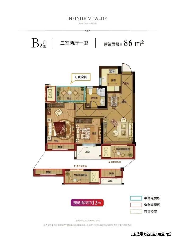 【86㎡户型】建筑面积约86㎡的两室两厅一厨一厅户型,可变空间充裕,北面的阳台稍作改装就能变成书房,这样一来就是非常标准的“小三房”。