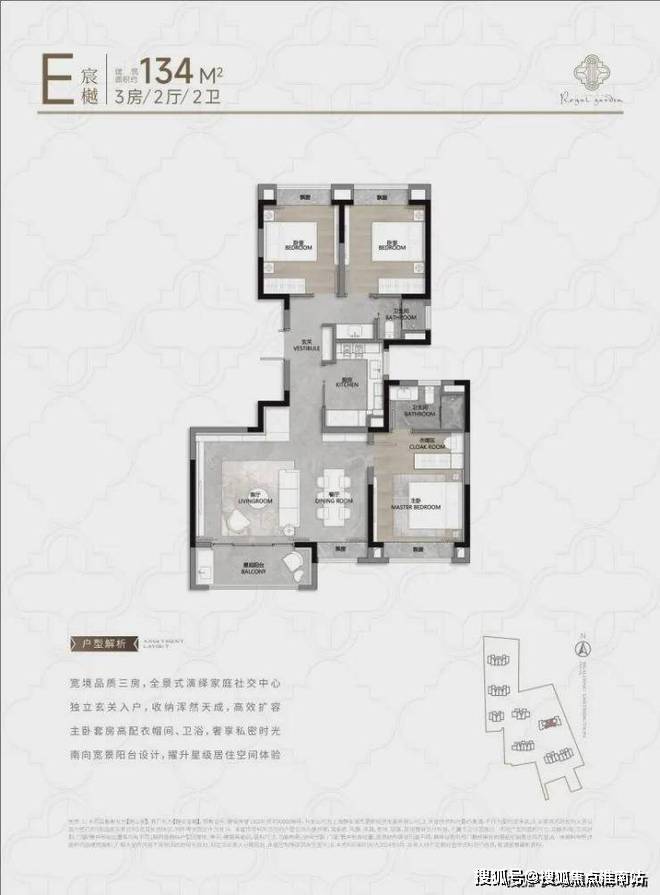 静安玺樾售楼处电话:400-891-9910(售楼处最新电话)上海静安玺樾官方电话:400-891-9910✔(官方售楼处预约看房热线) 104㎡3户型特点:该户型多为楼栋的东边套,是一个观景户型.客厅连接270°阳台,视野出众.双卧朝南,阳光满溢.从次卫布局看,如果家庭人口较少,该户型还能做成双套卧.
