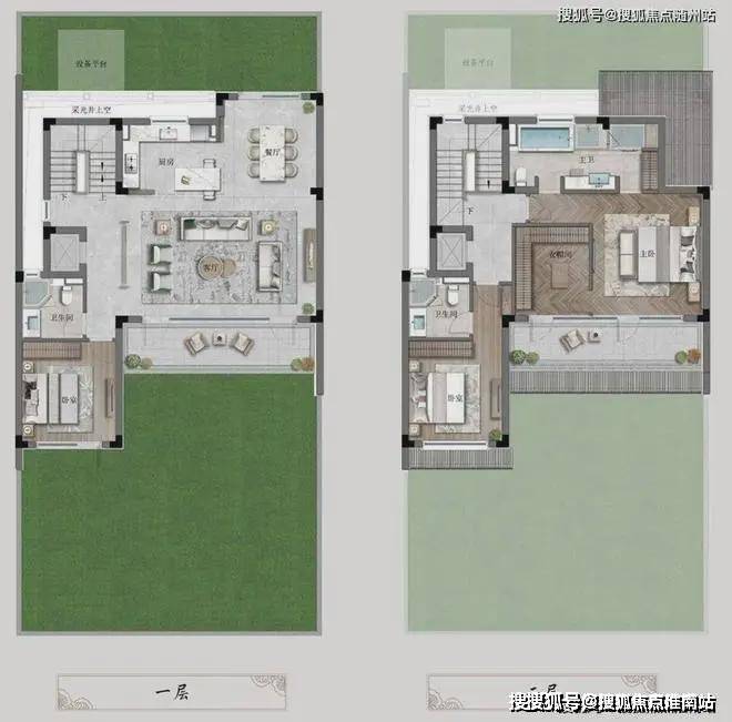 一层以日常起居为主,超大横厅、L型厨房、美食餐厅,还有独具匠心的南向卧室,可作为长辈房和客房,出入便捷,举步院外繁花小径,将天伦之乐和生活之美拥入怀中。