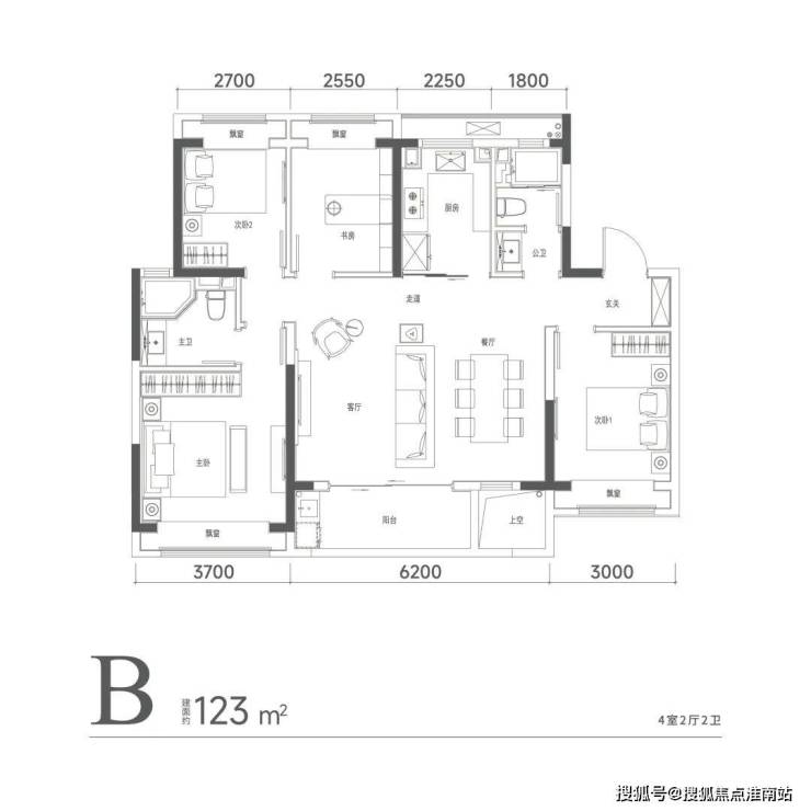 建面约123㎡做到了4房,且客厅面宽达 6.2米,主房间宽达 3.7米,且北面2间小房间根据需求可打通。