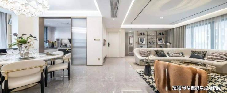 人性化细节也相当出彩。比如,客厅和主卧都 标配悬浮吊顶、无主灯设计,背景墙采用皮革和铝合金拼接,也都是实体交付的。