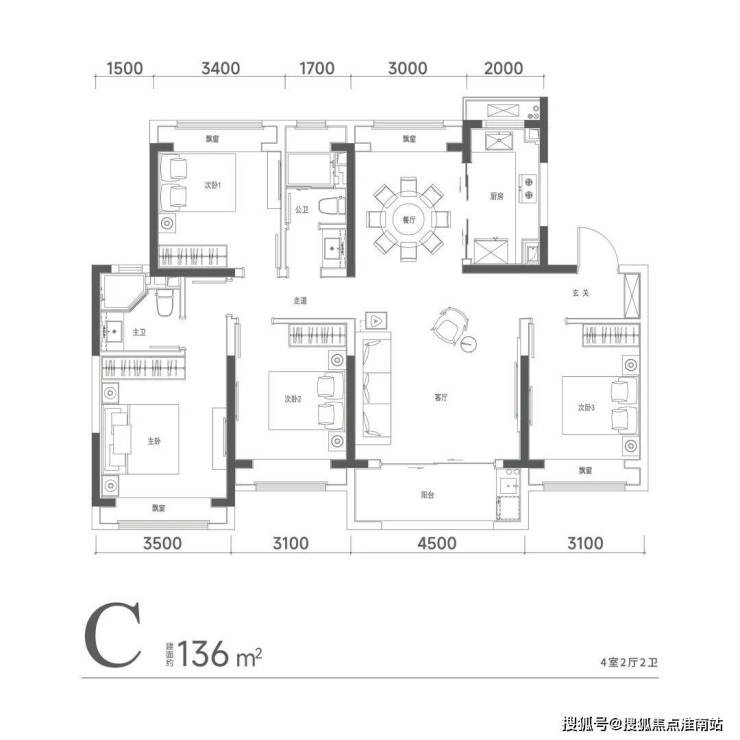 建面约136㎡客厅宽达 4.5米,主卧宽 3.5米,次房间分别达 3.1米、 3.4米,独立餐厅,靠窗南北通透。