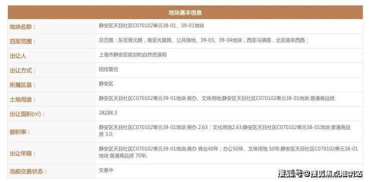 2020年10月,仁恒+华发联合体以42.1亿的价格竞得静安区天目社区,C070102单元38-01、39-01地块,溢价率为1.25%,成交楼面价52833.79元/㎡!