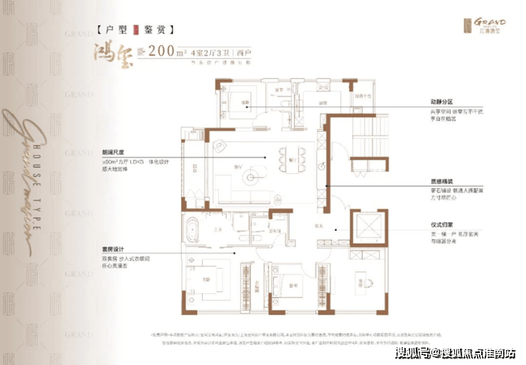 建面约200㎡4房2厅3卫户型,做到了三开间朝南+主卧豪华套房设计+南北通透,保证每个家庭成员都能有自己独立的居住空间,私密性拉满。