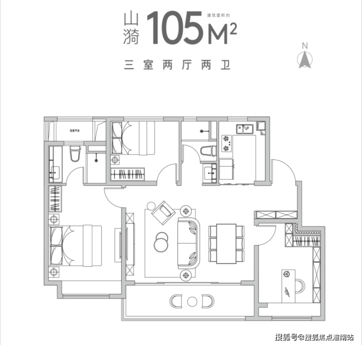 约105㎡户型同样实力不容小觑。受益于高得房率,约105㎡的空间呈现出了120㎡+的生活方式!