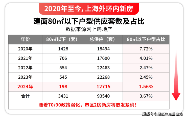 2024年外环内新房建面80㎡以下供应只有198套,且你能看到建面约80㎡以下房源占比逐年递减。