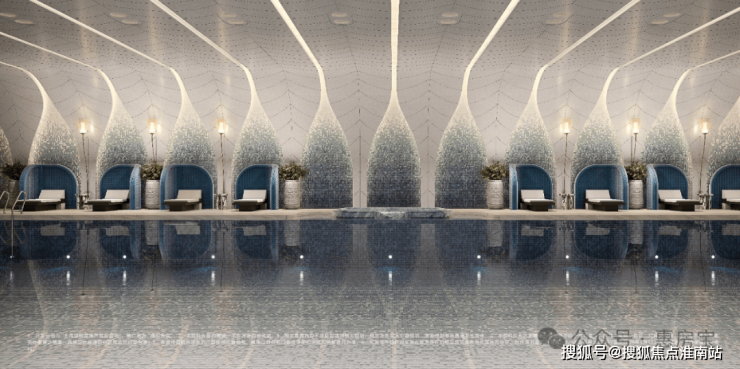 ⑤、情绪符号的渗透。我们还能看到很多情绪价值的设计,譬如豪宅专属 定制化的符号设计,融入到建筑、景观和空间,给到业主极强的身份感和标签感。 约1500m²国际会所,高压氧舱、桑拿、保龄球等前卫体验