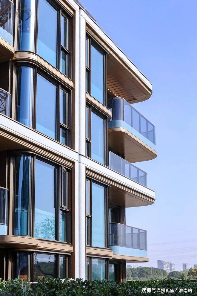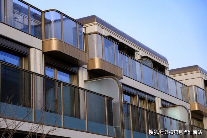联排采用轻法式风格,并融汇海派美学,建筑主体采用白色石材搭配深咖铝板、局部点缀金色金属线脚,使建筑整体呈现典雅温润的同时,不失精致度。